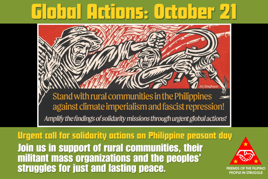 In this light, we call on the international community to join us in global action on the 21st of October, peasant day in the Philippines, in support of rural communities in the Philippines, their militant mass organizations and the peoples’ struggles for just and lasting peace.