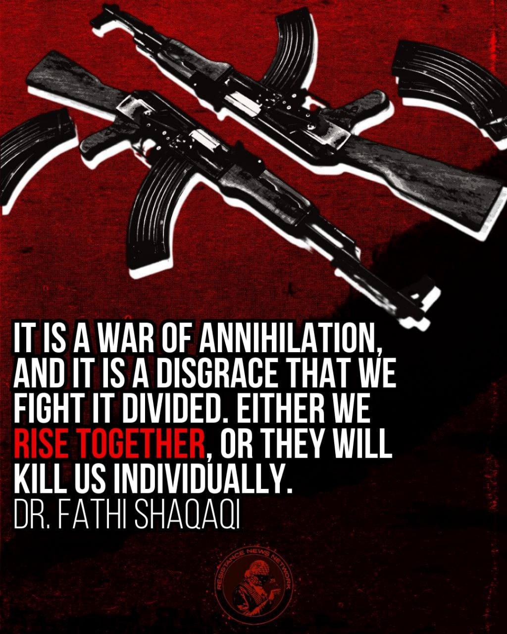 Dr. Al-Shaqaqi — through his thought, positions, and jihadist career — represented a turning point in the course of our people’s struggle and resistance against the zionist project on our land, Palestine. Since the movement’s beginnings he and his brothers worked to expose the danger posed by the zionist entity to the Arab and Muslim nation, and indeed to the whole world, portraying it as the spearhead of the Western colonial project directed at the heart of our nation, and as representing all evil and corruption… as events and facts have shown, the essence of the zionist project and its danger to Arabs, Muslims and the entire world have been exposed.