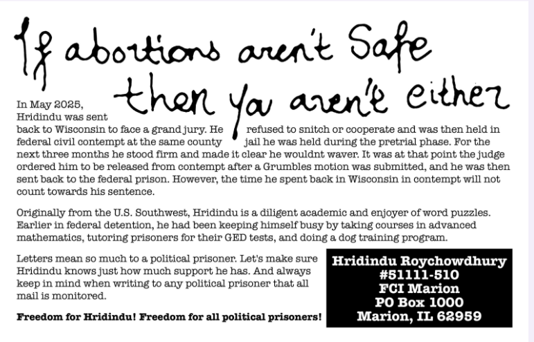 Hridindu Roychowdhury is an anarchist from Madison, Wisconsin who was sentenced to 90 months in federal prison for attacking a building with a Molotov cocktail in the wake of the leak of the draft opinion in Dobbs v. Jackson Women’s Health Organization, overruling Roe v. Wade.