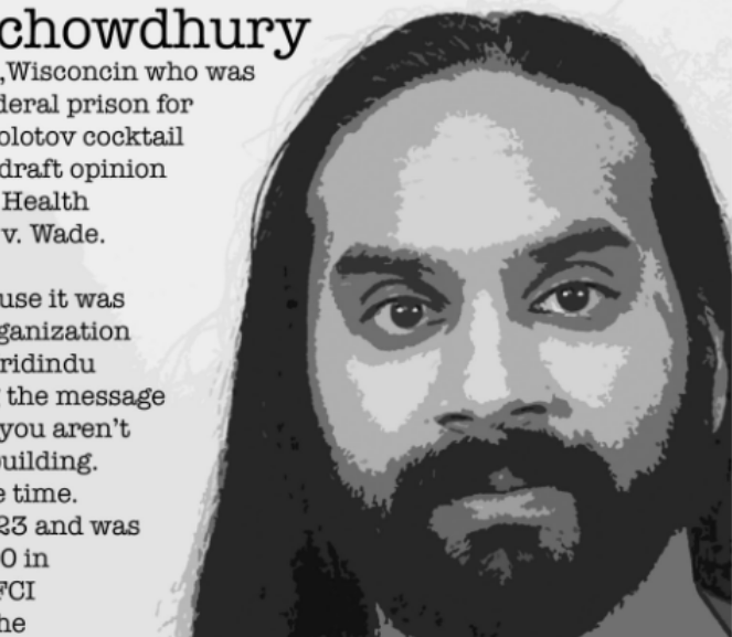 Hridindu Roychowdhury is an anarchist from Madison, Wisconsin who was sentenced to 90 months in federal prison for attacking a building with a Molotov cocktail in the wake of the leak of the draft opinion in Dobbs v. Jackson Women’s Health Organization, overruling Roe v. Wade.