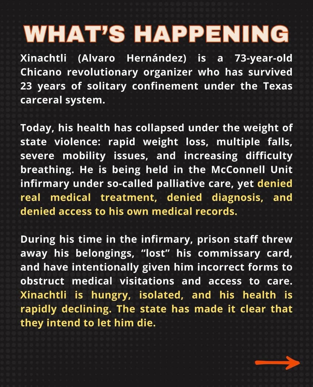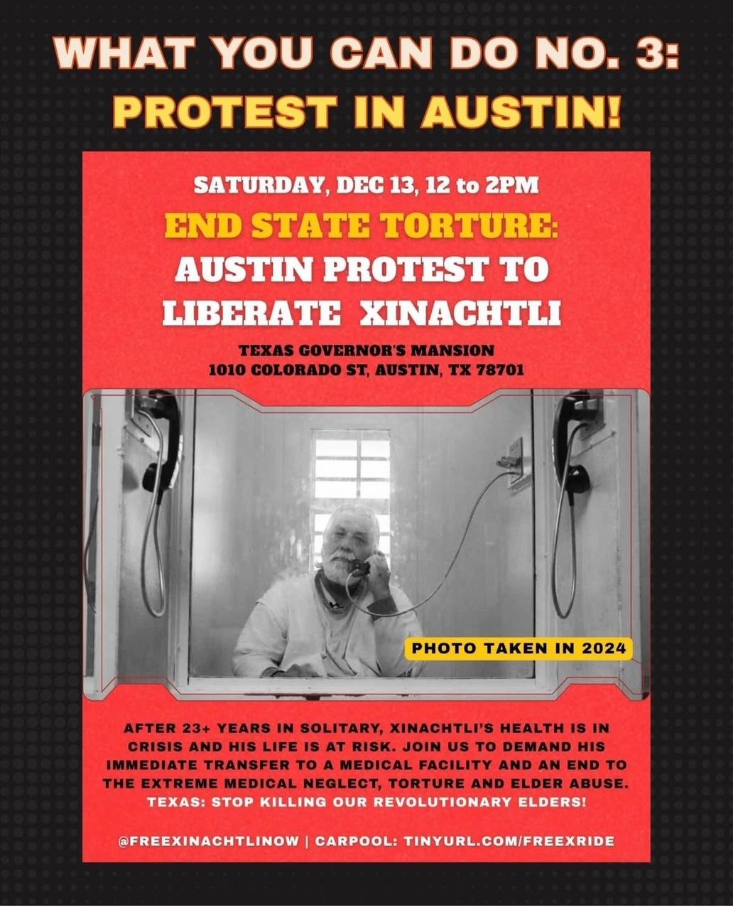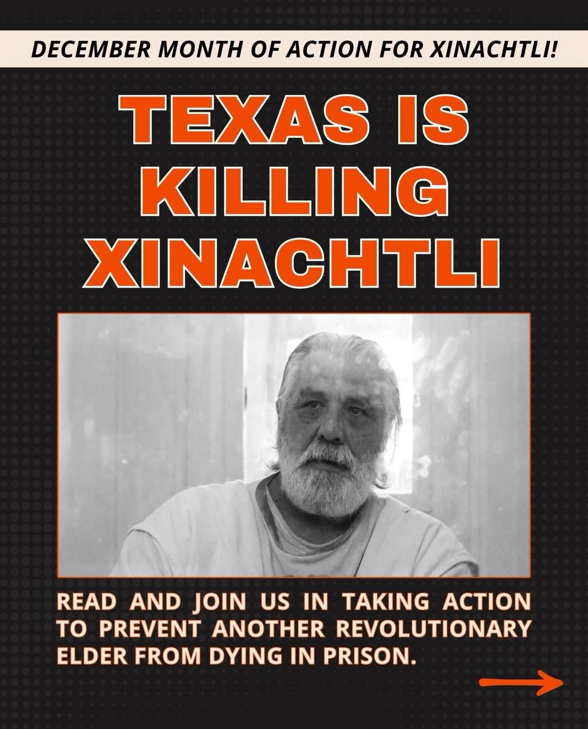 Every day and every moment counts. We refuse to let our revolutionary elder Xinachtli die by incarceration. Please read the full post for more information on his condition and how to take action.