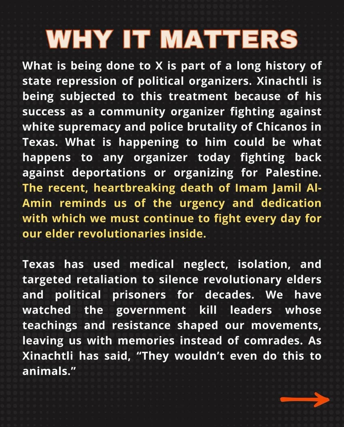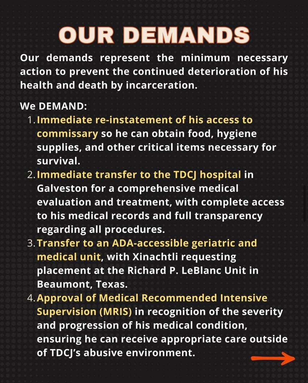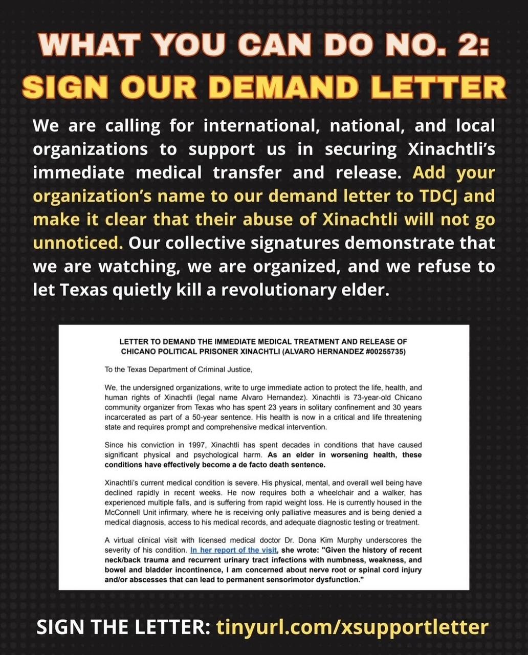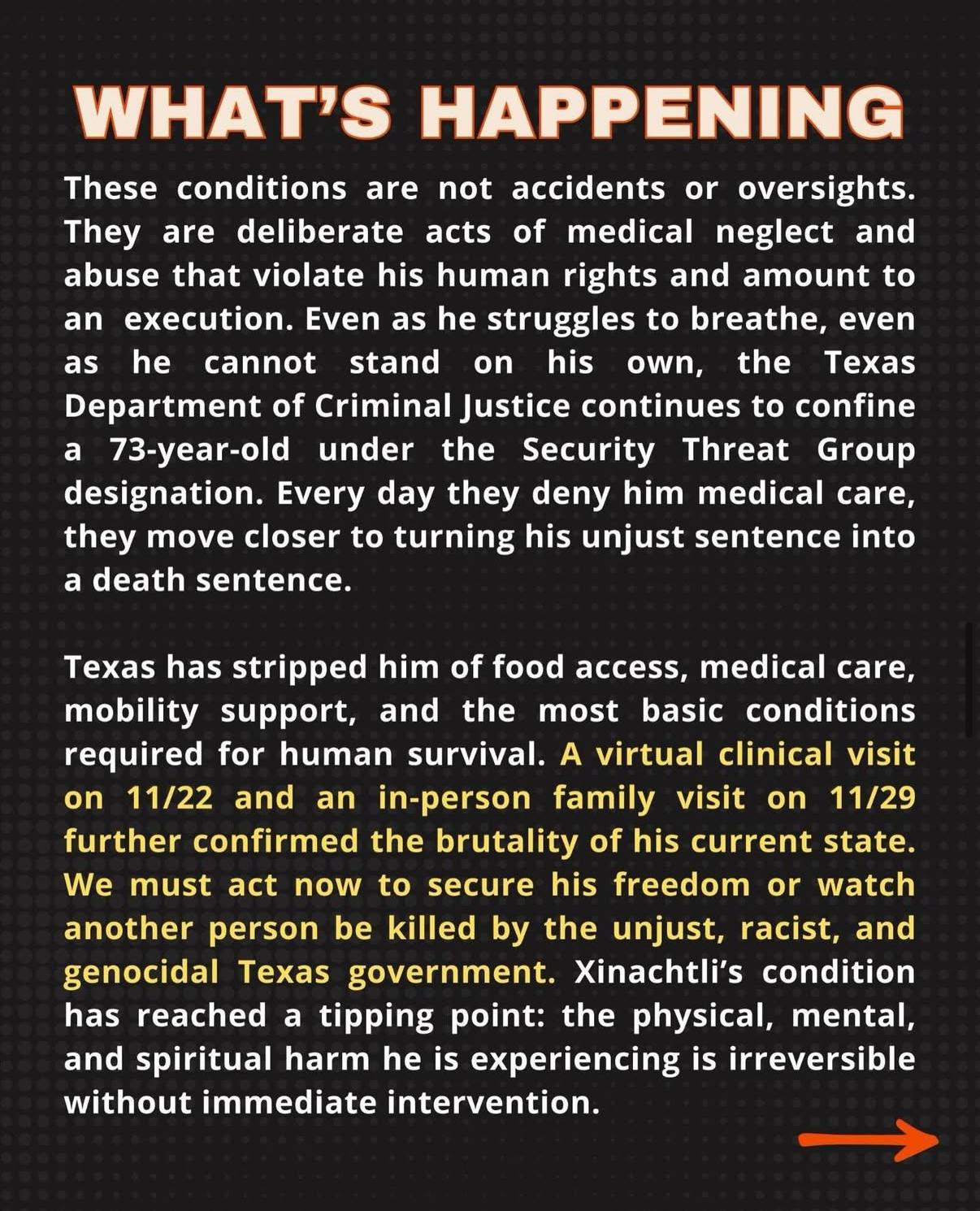 After weeks of medical neglect and declining health, we are calling for local, national and international support to demand that Xinachtli receives the critical medical care immediately!