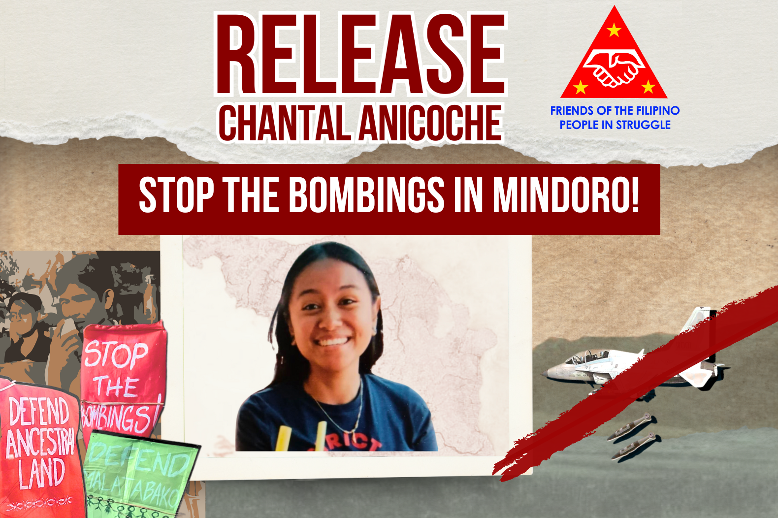 Friends of the Filipino People in Struggle (FFPS) strongly condemns the recent bombings by the Armed Forces of the Philippines (AFP) against the people of Mindoro and calls for the immediate release of Chantal Anicoche.