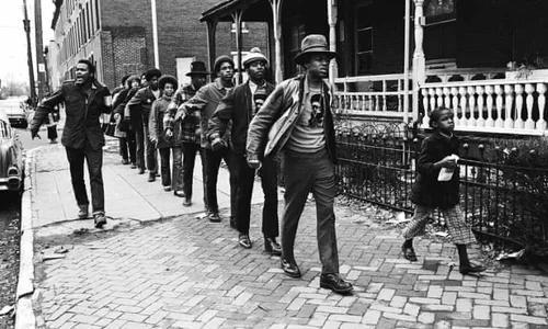Image: Khalid Raheem, at the front of the line, marching with the Black Panthers. Photograph: Stephen Shames/Polaris